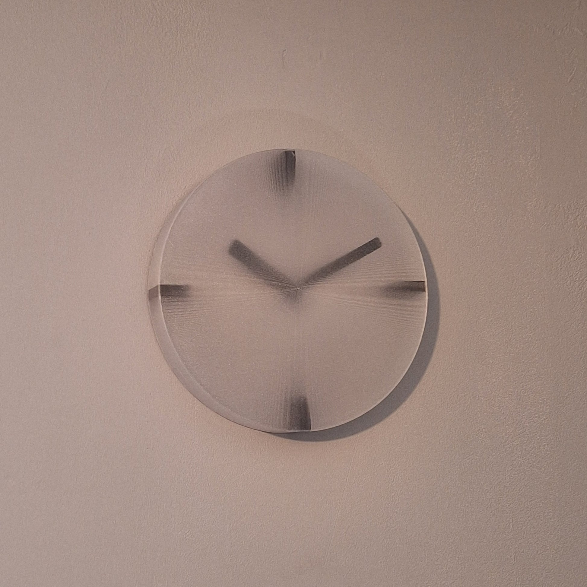 L’horloge F.O.G transforme le temps en une expérience visuelle apaisante. Son disque translucide diffuse la lumière et adoucit les formes, comme une brume légère suspendue au mur. Derrière ce voile subtil, les aiguilles noires se devinent et se déplacent avec calme, créant un effet de flou élégant et poétique.